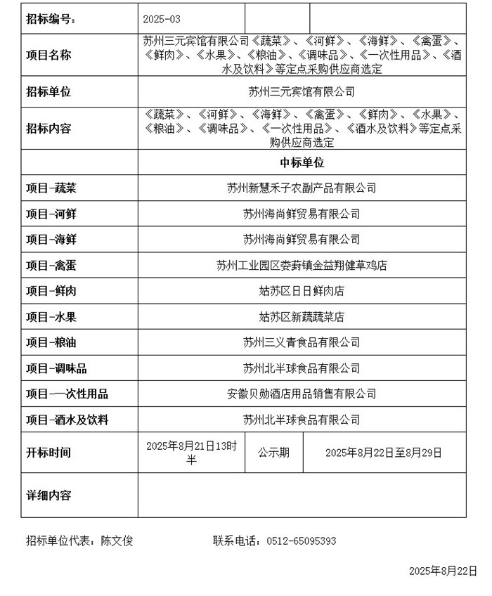 关于开奖记录计划《蔬菜》、《河鲜》、《海鲜》、《禽蛋》、《鲜肉》、《水果》、《粮油》、《调味品》、《一次性用品》、《酒水及饮料》等定点采购供应商选定项目的公开招标采购网上发布中标信息