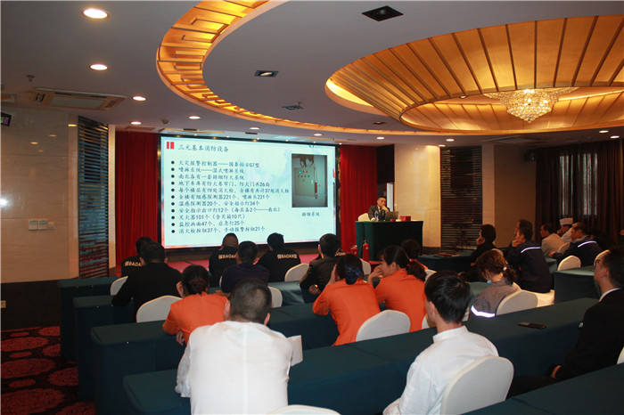 会上,宾馆安全专员方毅向全体义务消防员详细介绍了三元宾馆现有的消防设施设备,对火灾探测器的种类、报警系统、卷帘门和防火门的类型、消火栓的组成等消防设备进行了培训,对灭火器、灭火毯、消火栓的使用方法进行了讲解和演示
