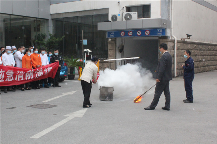随后,疏散到广场的全体员工进行了灭火演练,主要是灭火器使用灭火操作和义务消防员进行消防水带放接使用,要求员工掌握使用灭火器,并要以最快的时间灭掉火源。