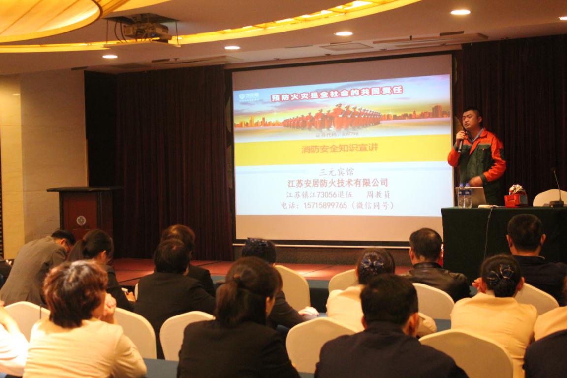 4月15日下午两点,三元宾馆在多功能厅举办今年上半年度全体员工消防安全知识培训,本次培训专门聘请南京安居防火培训中心的周宇峰教员为全体员工介绍有关消防的安全知识。