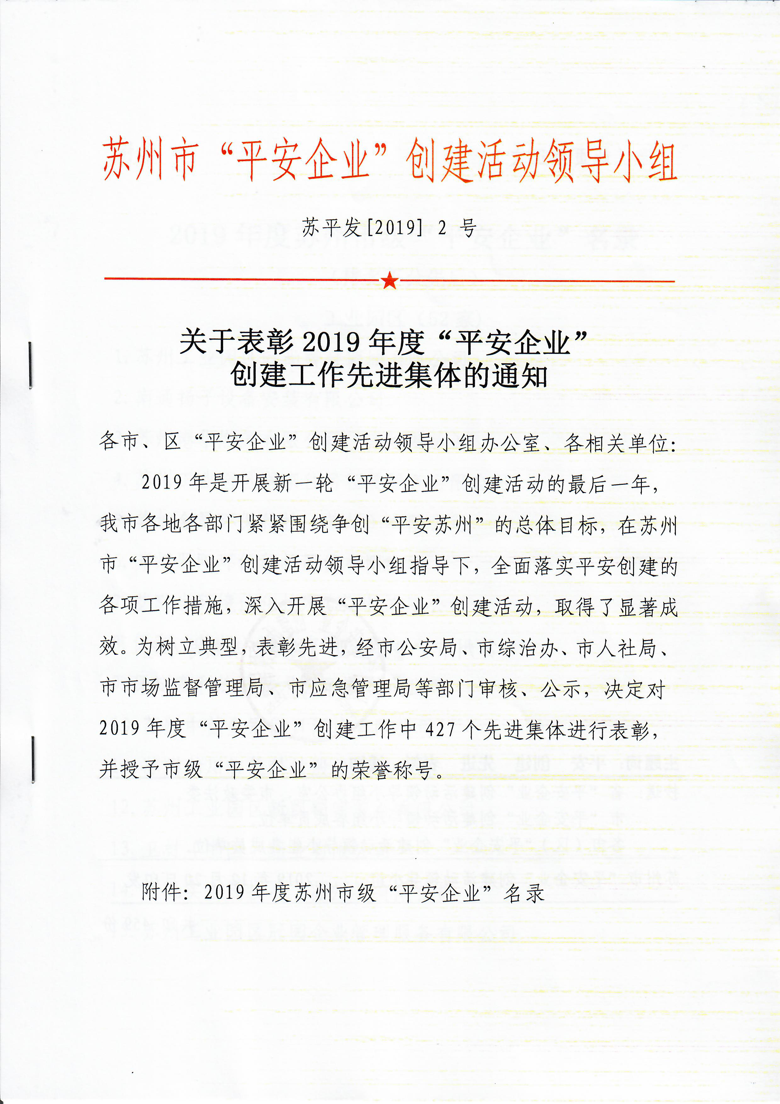 近日,苏州市“平安企业”创建活动领导小组发布关于表彰2019年度“平安企业”创建工作先进集体的通知(苏平发【2019】2号),三元宾馆被评为2019年度“平安企业”创建工作先进集体,并授予苏州市级“平安企业”荣誉称号,该荣誉的获得是对三元宾馆2019年度安全管理工作的充分肯定。