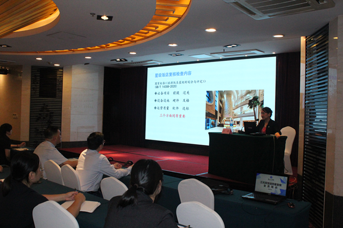 随后,丰群副总经理通过生动的视频从星级饭店复核检查要点、检查员的视角是多维的、全员积极准备迎接星级复核现场检查方面对星级复核工作各个环节作了详细的讲解,重点对四星复核中遇到的具体问题结合真实案例进行了深入剖析,提出了规范服务是基础,精细管理是根本,特色服务是升华,满意+惊喜=锦上添花的工作要求。