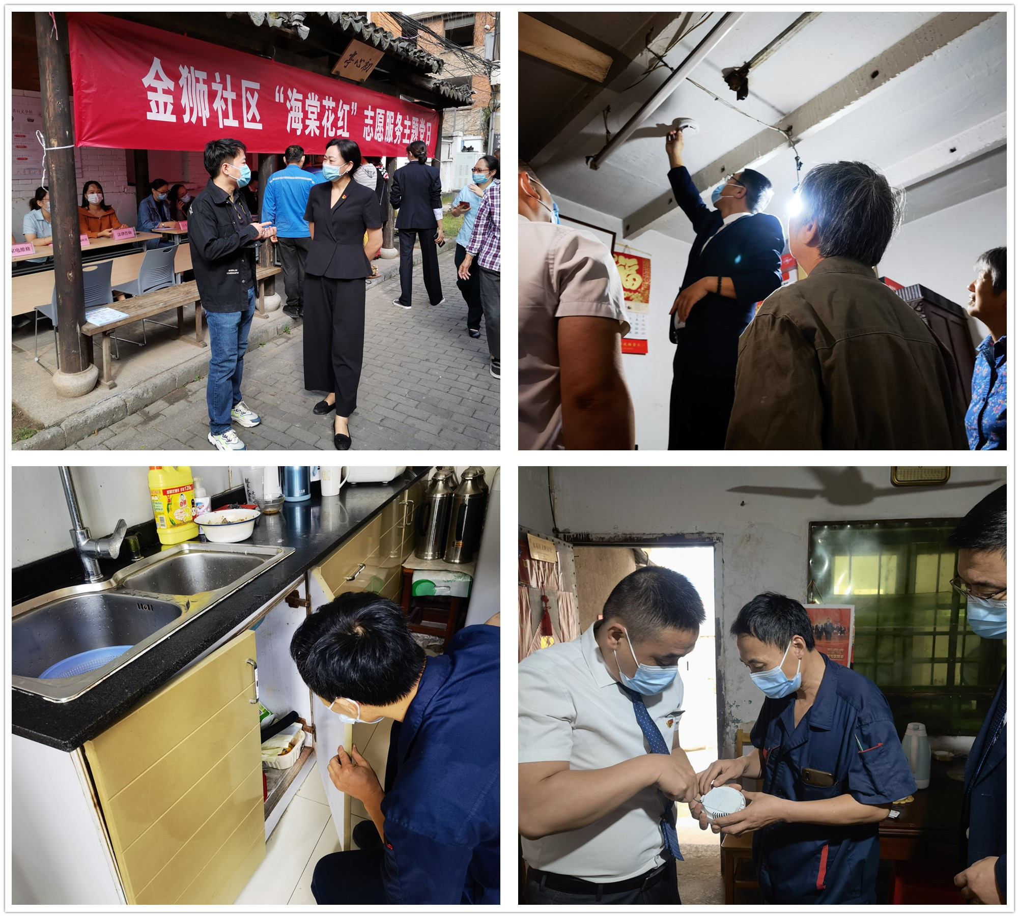 在金狮社区的初心亭里,前来的老人们络绎不绝,党员志愿者们热情的为社区居民免费测量血压和血糖,检查、维修居民带来的小家电。随后,党员们和社区志愿者一起到居民家中,帮老人们检查烟感报警器是否正常并更换电池,检查家中水电线路是否老化,排除安全隐患,让老人们增强安全感、幸福感、获得感。